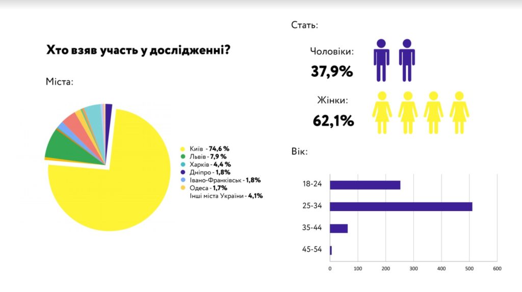 У досліджені, яке тривало трохи більше місяця, взяли участь понад 800 дизайнерів. Це представники різних напрямів сфери: графічні, продуктові, веб-, UX/UI-дизайнери, ілюстратори та інші. Серед них 43% склали графдизайнери. Майже три чветрі усіх респондентів —кияни, також серед опитаних були дизайнери зі Львова, Харкова, Дніпра та інших міст України.