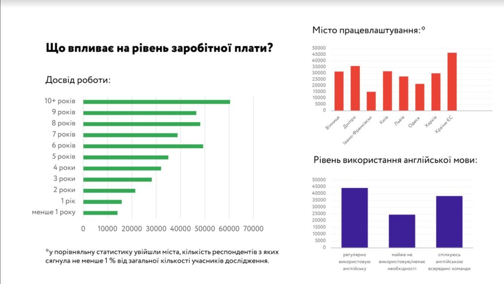 Також дослідження показує, які фактори впливають на зарплати. Серед них — досвід роботи, місто працевлаштування і рівень використання англійської мови. Так, фахівці які в роботі з клієнтами чи партнерами регулярно спілкуються англійською, заробляють в середньому на 14 000 гривень у місяць більше, ніж ті, в кого такої потреби немає.