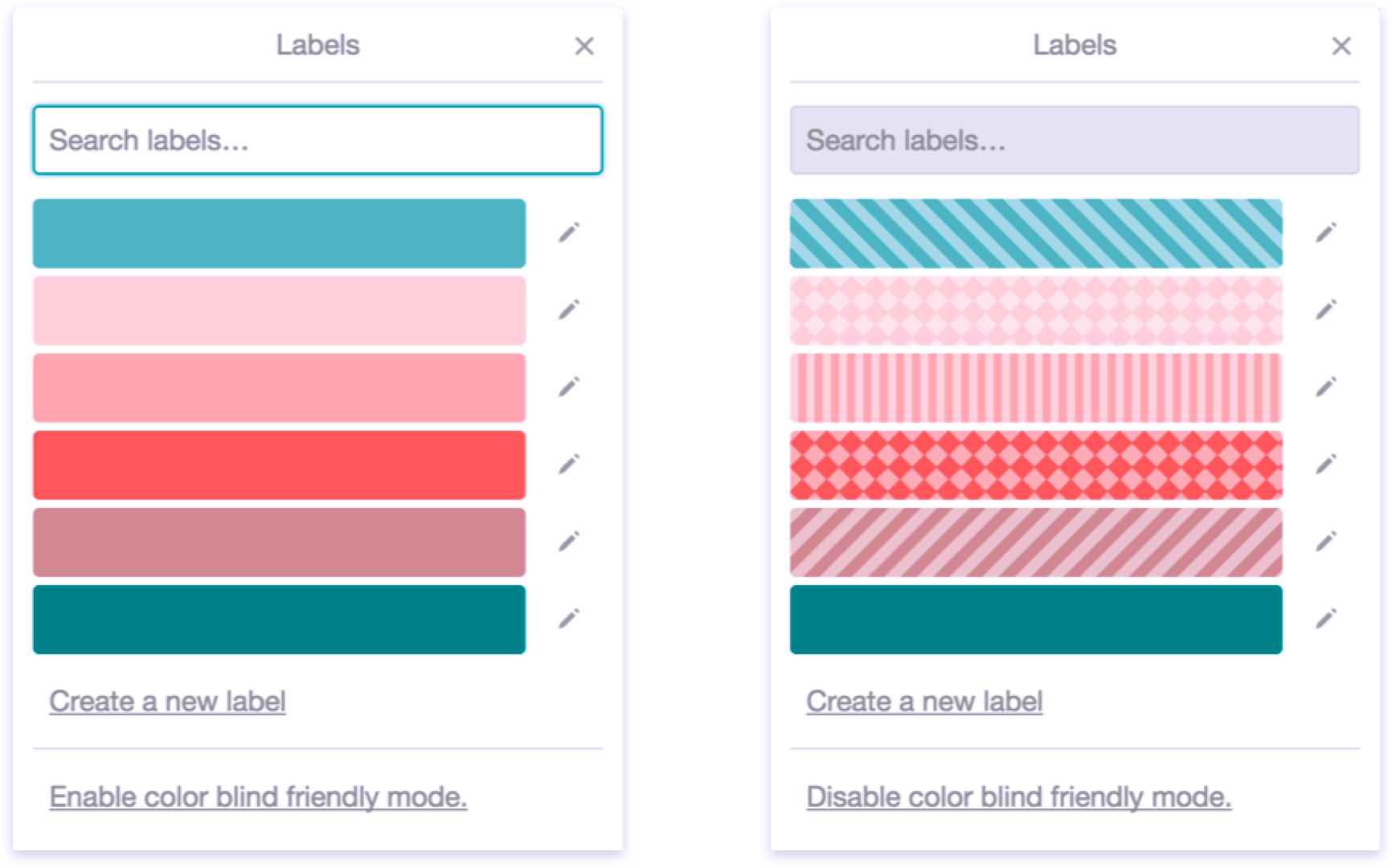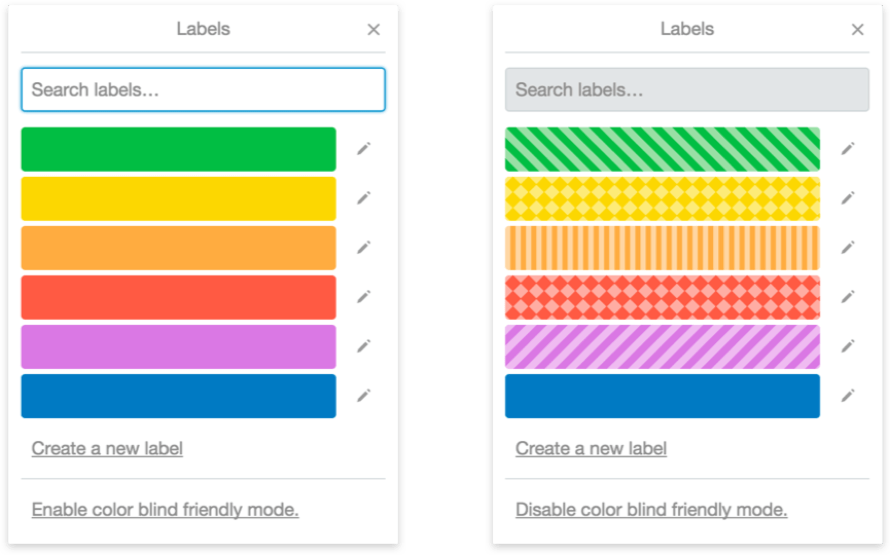 Trello использует текстуры, чтобы помочь пользователям с дальтонизмом различать лейблы. Давайте рассмотрим, как это работает для разных типов дальтонизма: