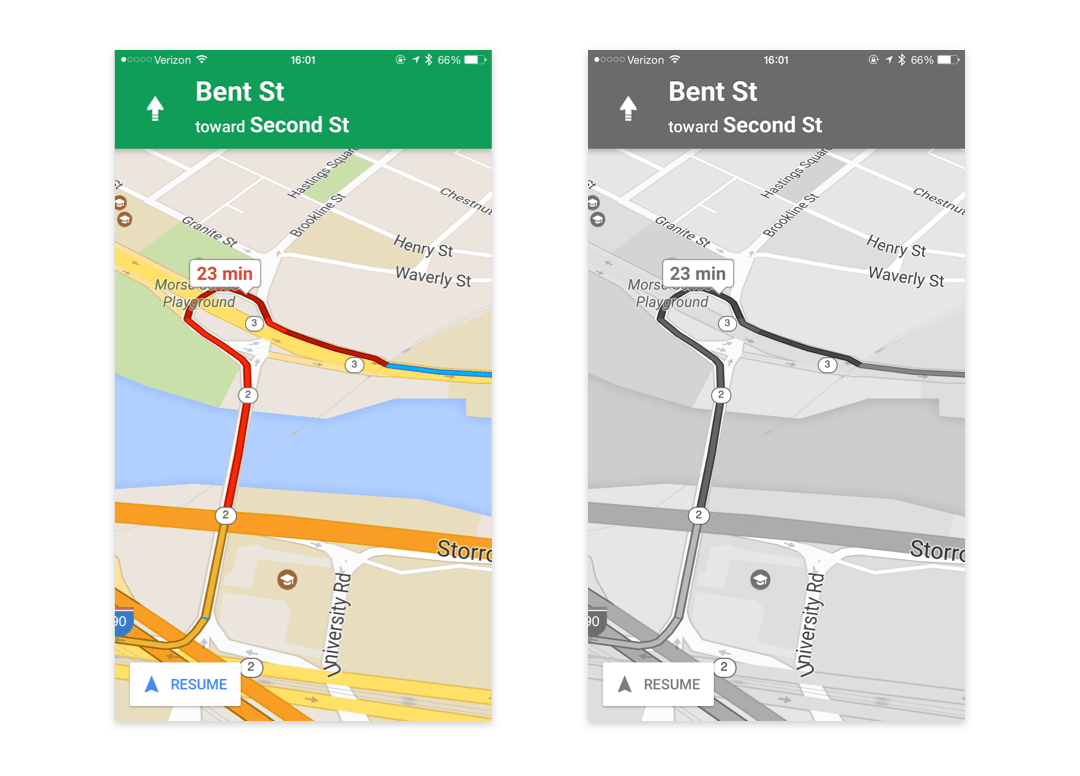 Google Maps использует контраст для индикации плотности трафика. Даже в черно-белом режиме зоны с разной плотностью движения легко различаются между собой.