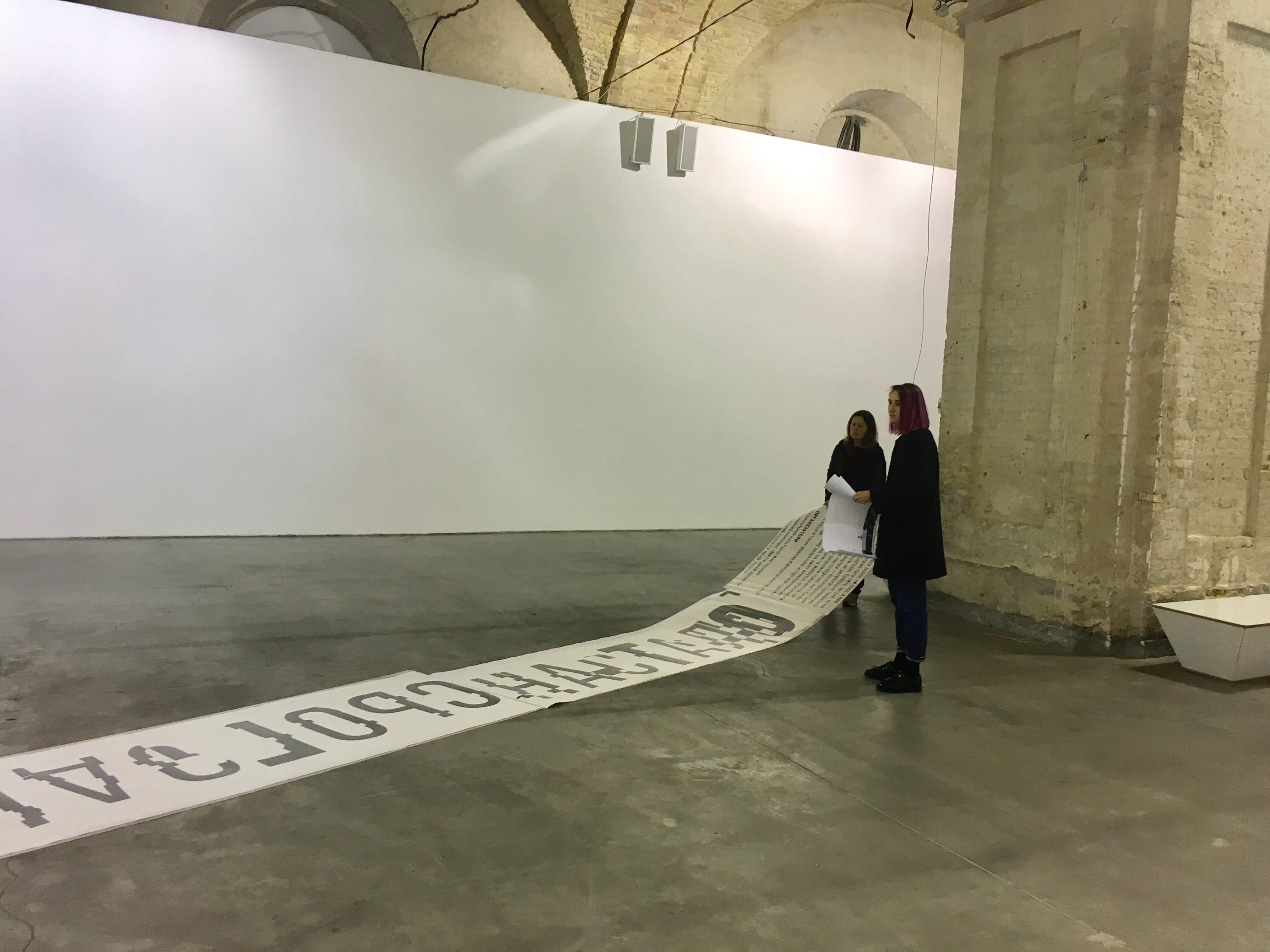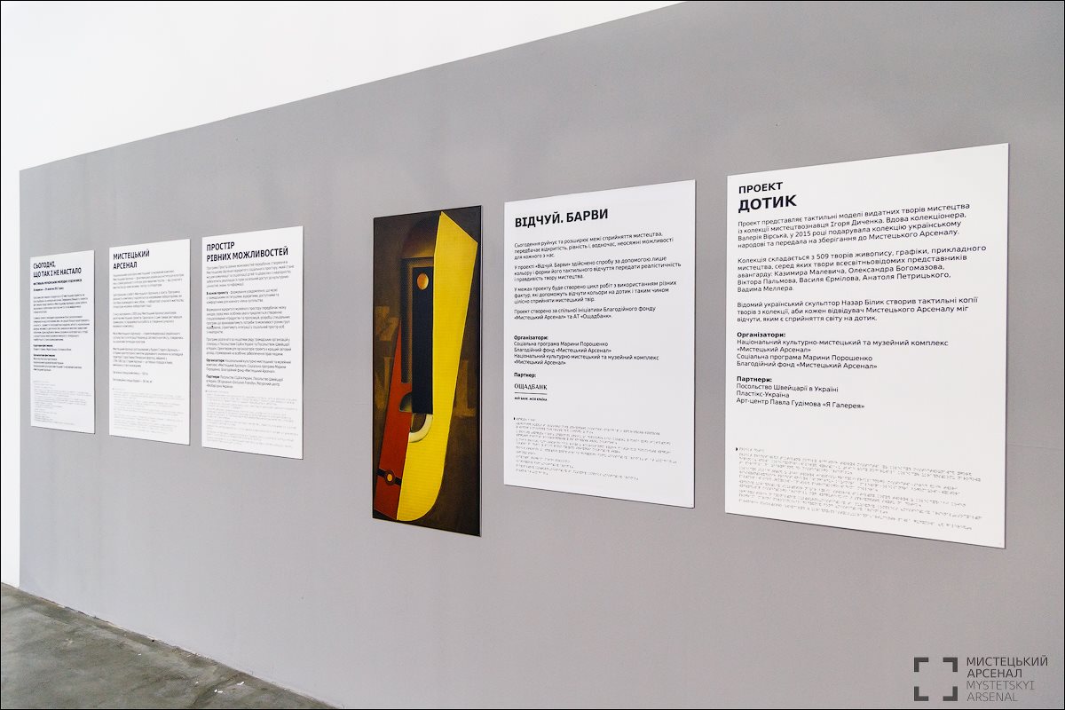Для всей выставки разрабатываются кэпшенсы на двух языках с описанием и подписью работы. Они многих удивляют размерами. Но следует понимать, что обычные галерейные подписи в масштабах Арсенала не подходят. Маленькие, аккуратные, интеллигентные — нет. Пространство большое, в таком формате они теряются. Кроме того, мы очень нацелены на предоставление равных возможностей для всех и универсальный дизайн. Поэтому таблички с общей информацией дублируются шрифтом Брайля. Некоторые окрашиваются в желтый цвет для тех, кто плохо видит. Поэтому и надписи больше обычного. Они подойдут слабовидящим и тем, кто пытается рассмотреть название в толпе. На наших выставках это не редкость. Мы пытаемся сделать дизайн комфортным для всех.
