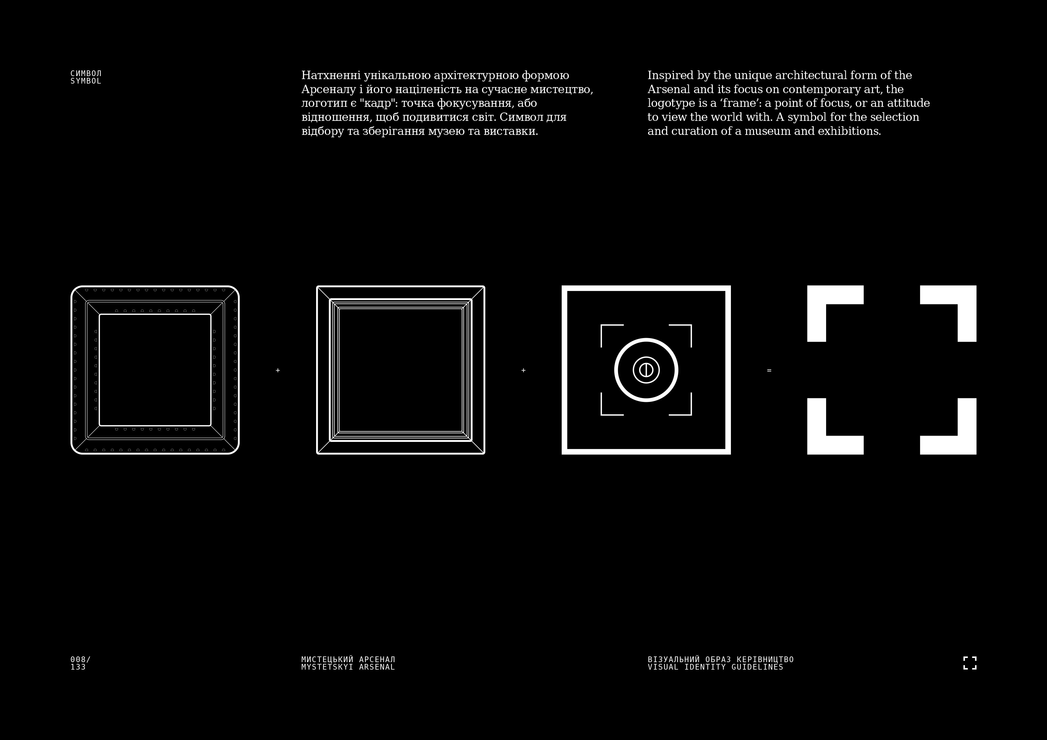 Брендбук «Мистецького Арсеналу» был разработан еще до того, как я начала здесь работать в феврале 2017 года. Его создал Джонатан Барнброк, известный лондонский дизайнер. Он работал над большим пакетом графики для биеннале 2012 года. Тогда же он создал логотип и фирменный шрифт для Арсенала, причем в разных вариациях.