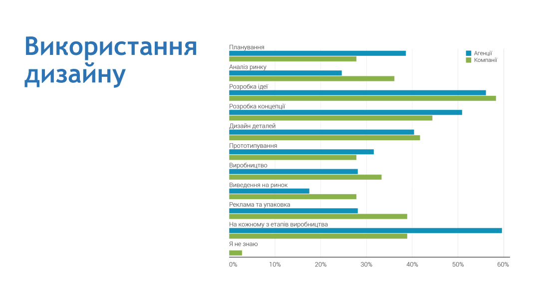 Світовий досвід доводить: модель бізнесу, у якій дизайн застосовується систематично на всіх етапах виробництва, є найбільш конкурентоспроможною. Результати опитування українських представників промислового дизайну демонструють, що агенції намагаються використовувати інструменти дизайну на всіх етапах роботи над продуктом, чим підсилюють ефективність виробників, з якими співпрацюють.