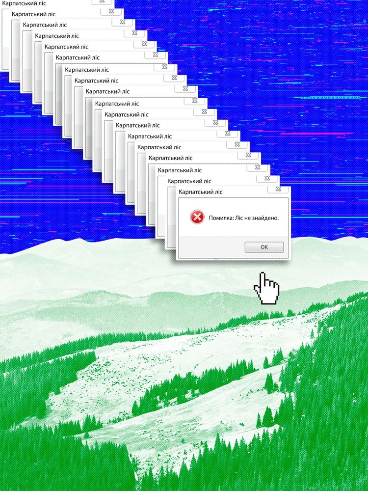А ось і про «залисини» карпатського лісу плакат української дизайнерки Дарини Задорожної. Монотонний ряд однакових табличок на екрані монітора, що швидко шикуються одна за одною…«Помилка. Ліс не знайдено». Знайоме відчуття відчаю і безнадії від неспроможності чимось зарадити. Коли працюєш за комп’ютером – це пів біди. Біда – коли в реальному житті стикаєшся з подібним.