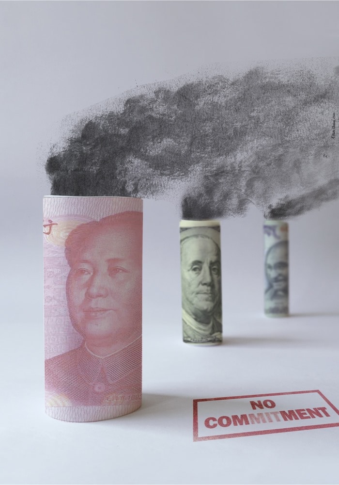 Плакат з Німеччини Аельфледа Клаксона (Aelfleda Clackson) про міжнародну корупцію. У безнадійно сірому просторі зі скручених у рулончики-труби банкнот валом іде дим, породжуючи світ смертельного смогу. Як виживати майбутнім поколінням? «Немає зобов’язань – ні про що говорити». Тільки гроші.