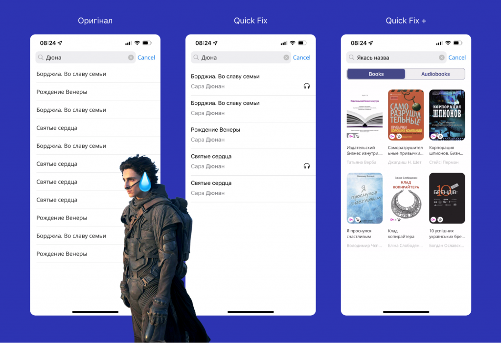 Кейс #2. Шукаємо «Дюна» — знаходимо жменю однакових результатів, часто це одна і та ж книга. До того ж не зрозуміло навіть чи це звичайна чи аудіо книга. Не зрозуміло чому книга потрапила в результати (в цьому випадку є збіг в прізвищі автора). Замість текстового списку можна було просто перевикористати верстку зі сторінки категорії.