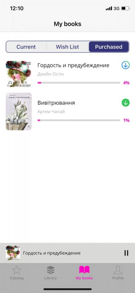 Куплене. Круто, що є можливість підтягнути вже куплене через сайт у додаток. Я взагалі радий шукати та купувати книги на сайті — так буде швидше. Єдиний нюанс — список не синхронізується автоматично, тому треба йти в «профіль» і тиснути на кнопку «відновити покупки» (яка виглядає як вкладка). Нічого не заважає розробникам перенести кнопку сюди.