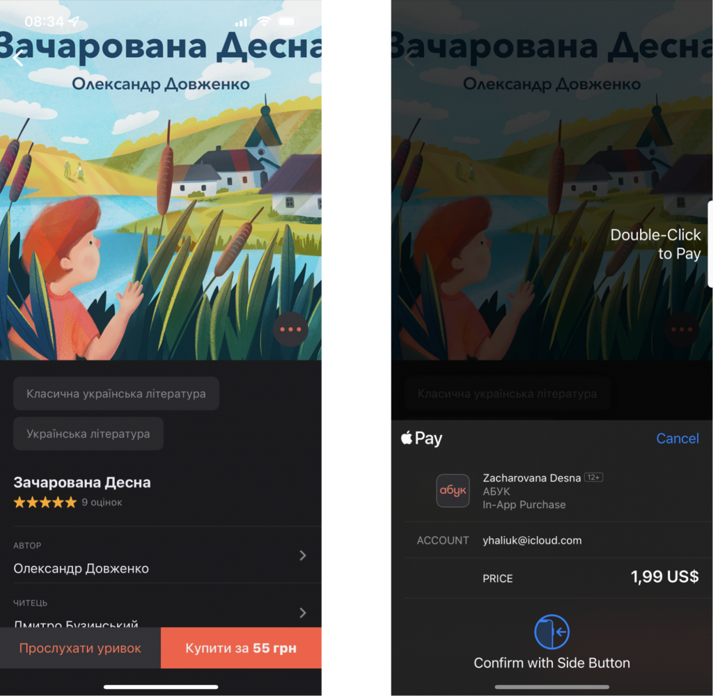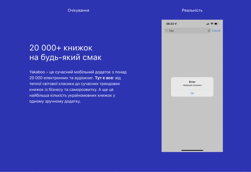 Мінуси. Навіть зручний вхід перетворюється на проблему, коли його нав’язують на початку. Yakaboo належить до тієї категорії додатків, де основна Value Proposition полягає в контенті. Тобто для клієнта в першу чергу важливо дізнатись чи є там що почитати-послухати, але додаток не дає можливості ознайомитись із вмістом. Як мінімум додаток мав би дати можливість пропустити вхід, як максимум взагалі відкласти його на потім.