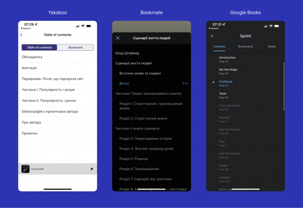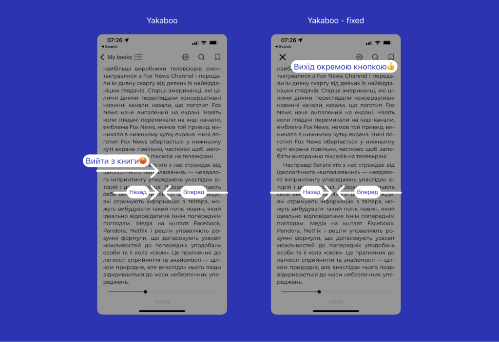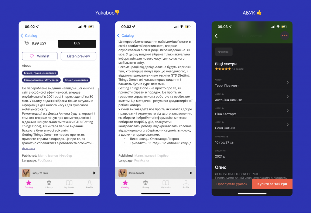 Процес читання/слухання книги мультисесійний. І коли вже користувач почав щось слухати, важливо, щоб він максимально легко та швидко міг повернутись до читання. В Yakaboo користувачеві спочатку чомусь показують статичну сторінку каталогу і змушують його вручну переключатися на вкладку з книгами. Споживання контенту — головна фіча додатку, тому дуже дивно, що вона прихована від користувача.