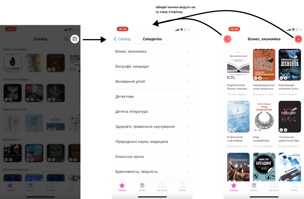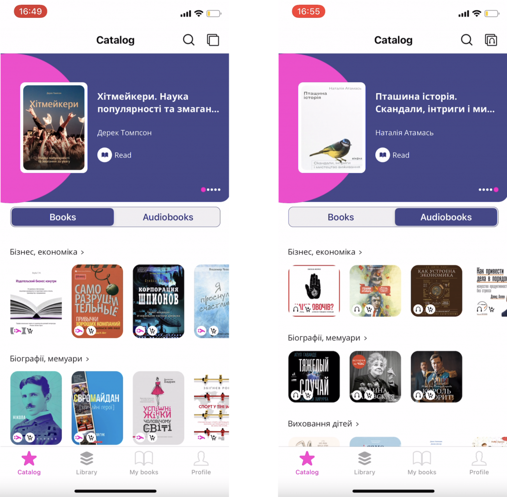 Каталог — це стартова сторінка, яка має давати користувачеві швидкий доступ до потрібної йому інформації. Рекомендації було б добре персоналізувати як на Нетфліксі. І розробники це чудово розуміють, бо на промо матеріалах додаток має і «Топ книг з високим рейтингом» і «Топ аудіокниг».