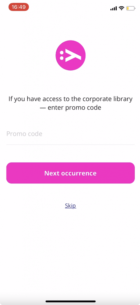 Після авторизації нас очікує ще одна перепона: введіть корпоративний промокод для бібліотеки. Що таке та бібліотека і чи є вона в мене, я не маю уявлення, тому пропускаю цей крок.