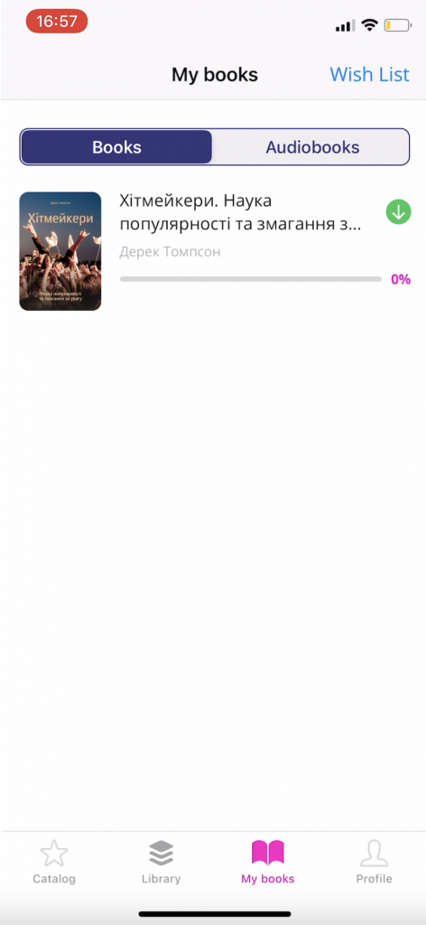 Список бажань. Тут просто перевикористаний код з першої вкладки. Якщо книга в мене у вішлісті, значить я її ще не маю, тому прогрес бар можна було б прибрати, як і можливість завантажити книгу.