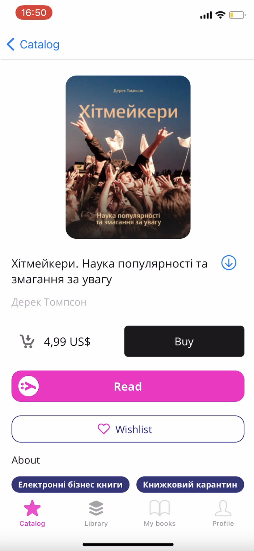 Говорячи про теги, ви можете помітити, що кожна книжка має іконку візка супермаркету — тобто, що цю книжку можна купити. Якщо така опція є у кожної книжки, користі від неї мало. Актуальніше було б змінити іконку на ціну книги, яка відрізняється від книги до книги.
