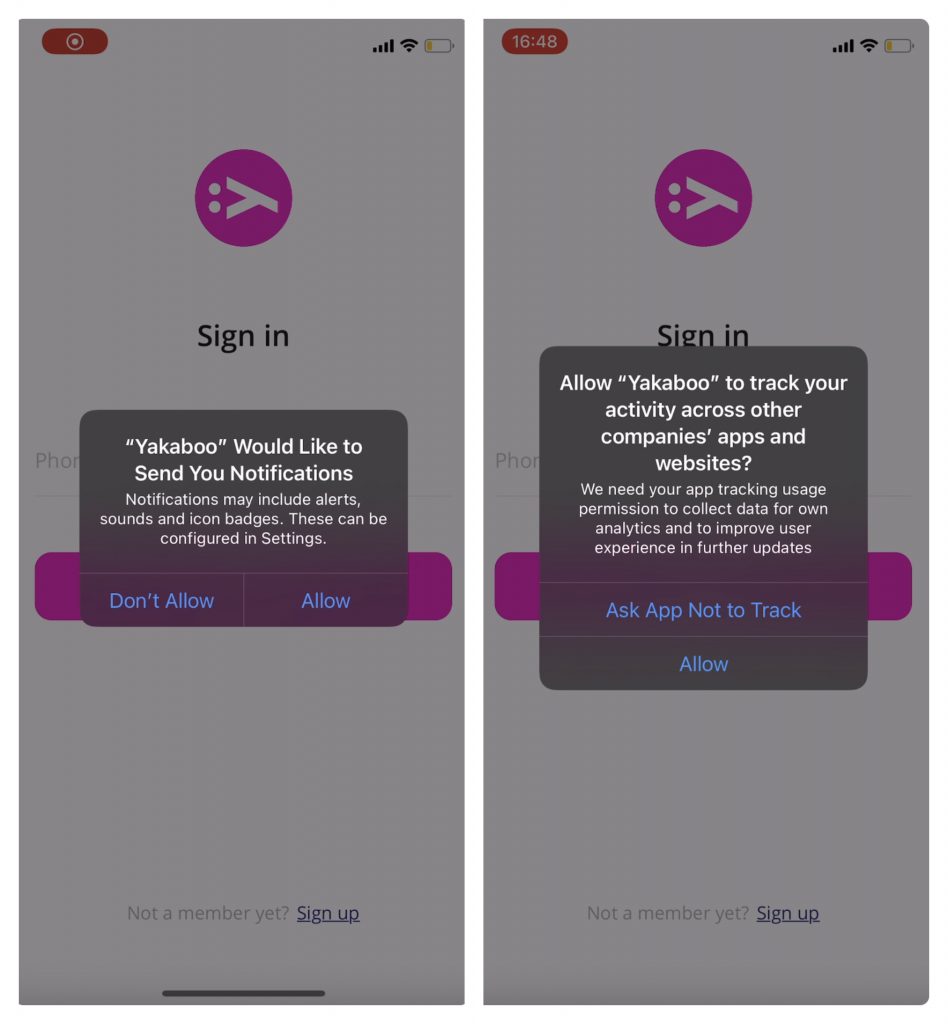 Відкриваємо додаток, і без зайвих формальностей нас просять дати доступ слати пуші. Тисну – «Ні, дякую» та очікую, що потраплю на екран входу, який бачу за діалоговим вікном. От наївний, там ще один попап! Цього разу Yakaboo хоче моніторити мою активність в інших додатках. Знову відмовляюсь, і тільки тепер додаток згадав про етикет та вирішив зі мною познайомитися.
