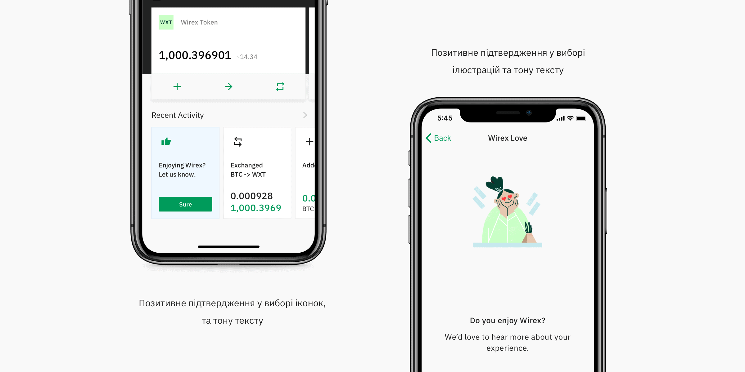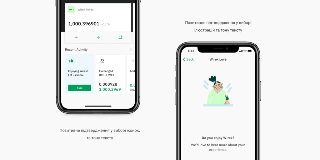 Попросити користувача оцінити додаток завжди непроста задача. Ніхто цього не любить робити, бо найчастіше для цього використовують модальні вікна, що перекривають собою інтерфейс у найнезручніший момент, та ще й благають поставити гарну оцінку (а це дратує). Саме тому ми в Wirex використали інший підхід. Після успішної операції поряд із карткою цієї операції з’являється банер. Він компактний, актуальний та не заважає користувачеві взаємодіяти з додатком. Для підвищення ймовірності схвального відгуку ми використали позитивні зображення (палець угору, задоволений персонаж, сердечка) та позитивно сформульовані запитання. Разом це ненав’язливо створює позитивну атмосферу та настрій у користувача.