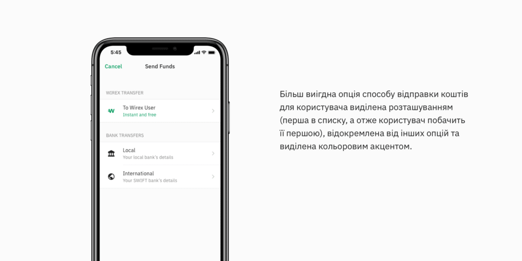 Найяскравіше себе цей принцип проявляє у дизайні планів підписок на сервіси та продукти (наприклад, підписка Tinder на 12, 6 та 1 місяць). Те, яку ціну людина побачить першою, вплине на те, як вона оцінить вартість та переваги інших опцій. У продукті Wirex ми виділили вигідніший метод відправлення коштів розташуванням (він перший в списку, а отже користувач побачить його першим), та відокремили його від інших опцій кольоровим акцентом.