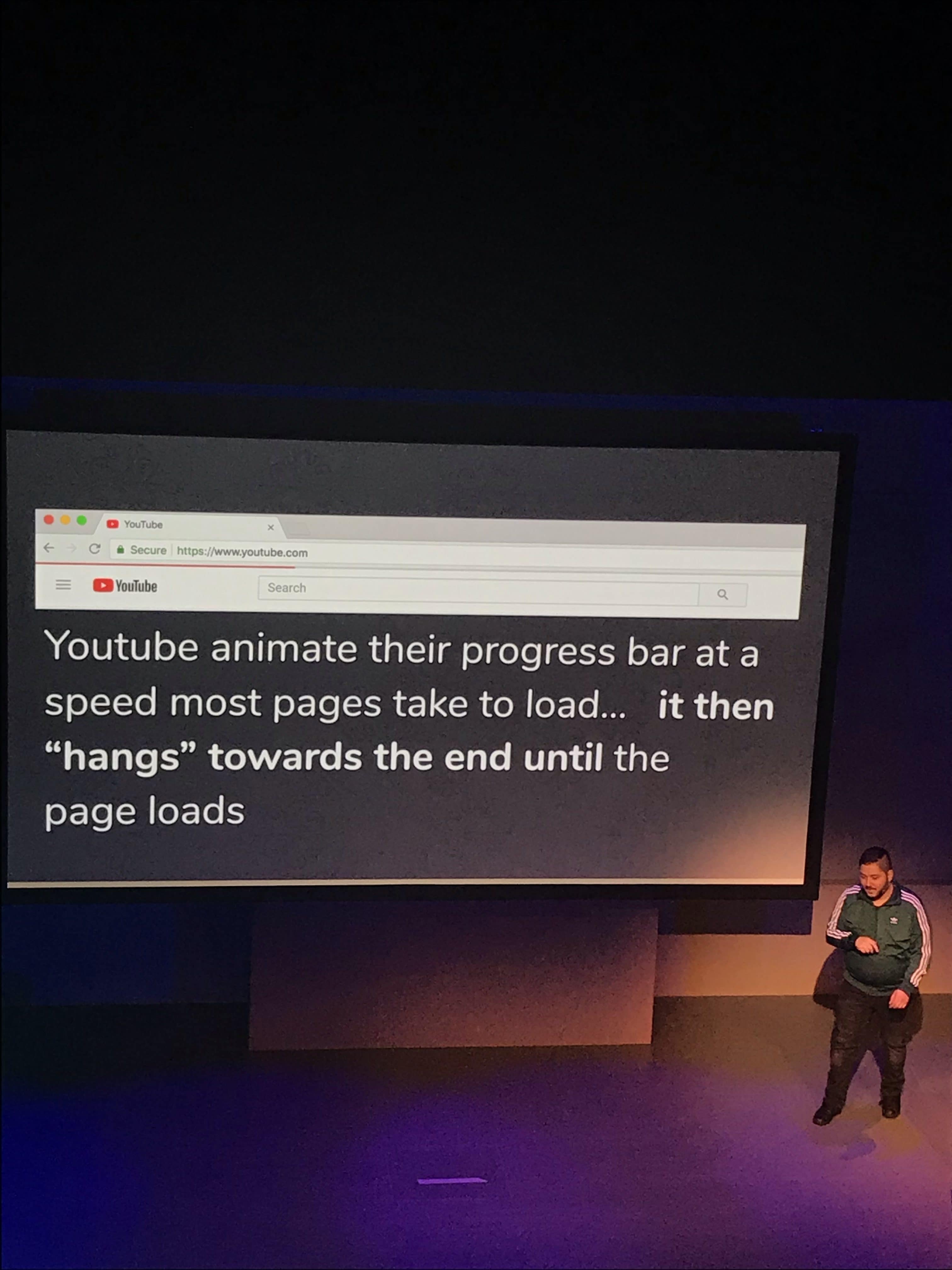 Смужка індикатора YouTube, яка з’являється під завантаження сторінки, це фейк. У якусь мить смужка зависає, поки сторінка не завантажиться повністю. Ця фішка допомогла зменшити кількість користувачів, які не дочекались завантаження сторінки і пішли.