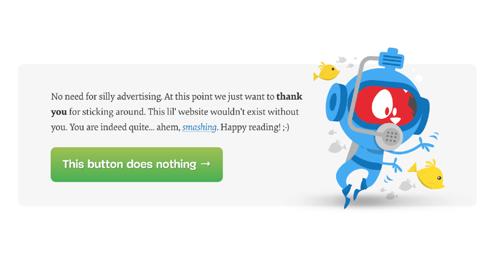 Очень важно рассказывать истории, люди их любят. Например, знаете, какая одна из самых нажимаемых кнопок на сайте? С надписью “This button does nothing”. Но в обратную сторону такой ход не работает, люди неохотно нажимают “This button does something”.