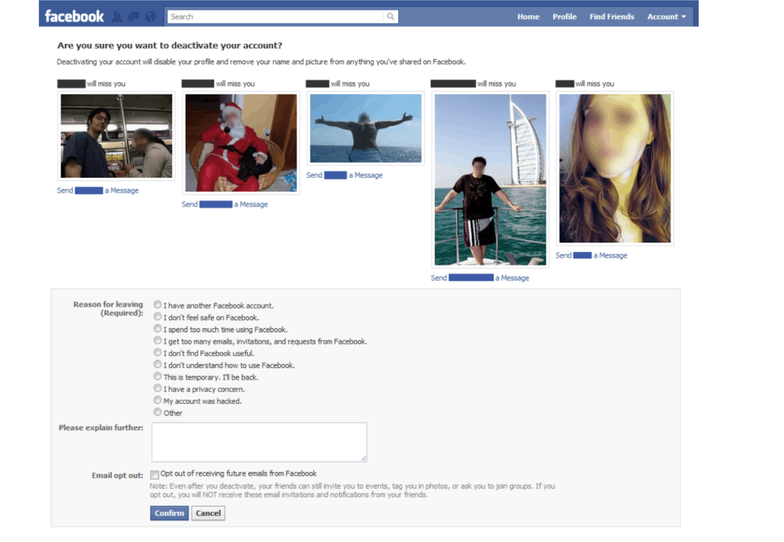 На Facebook перед удалением аккаунта тебе показывают аватарки друзей, сопровождаемые надписью: «Вы уверены? Эти люди будут скучать по вам». Не делайте так.