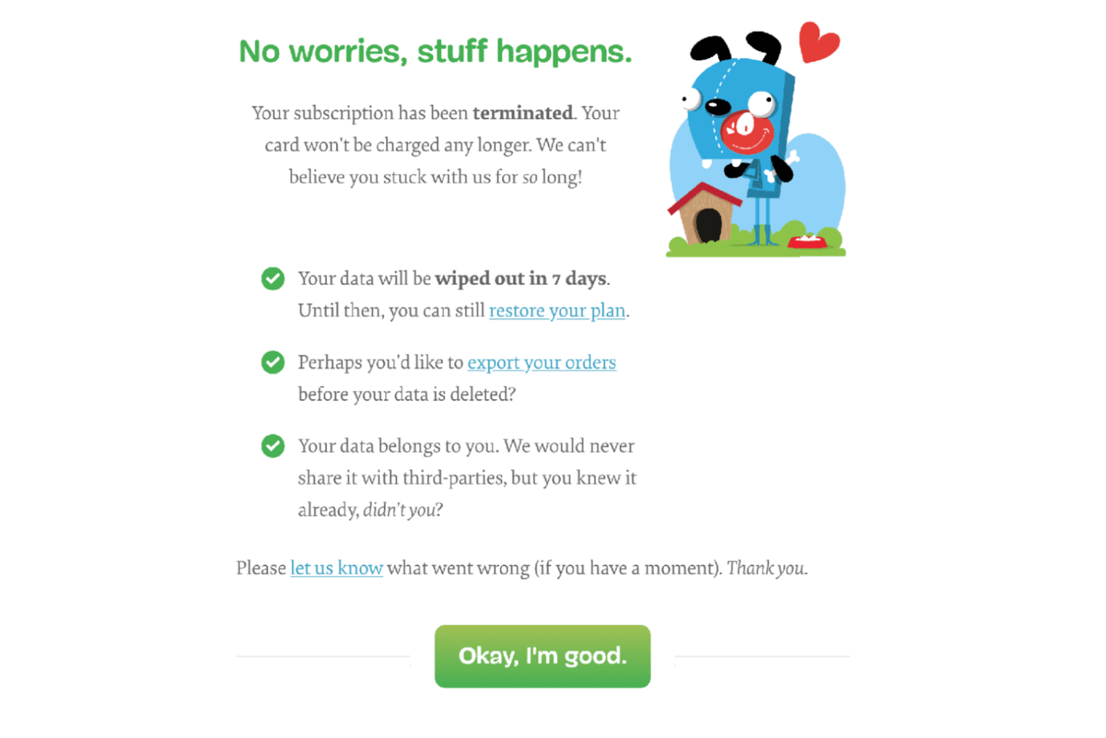 Off-boarding процесс тоже проходит гладко. Если люди от нас уходят и удаляют аккаунт, мы их подбадриваем. Напоминаем, что они могут возобновить членство в течении 7 дней, а также сохранить себе список заказов.