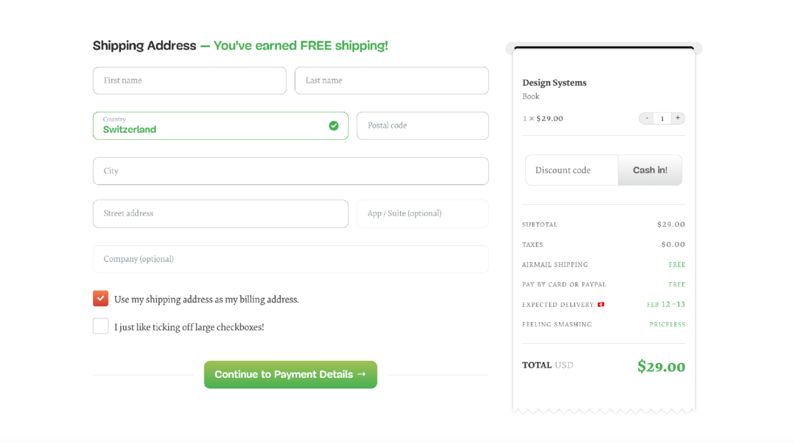 На форме заказа мы добавили самый популярный на сайте чекбокс: «Я просто люблю ставить галочки в больших чекбоксах». В этом месте традиционно ожидаешь увидеть «Подписаться на рассылку новостей». Но такой чекбокс работает лучше.