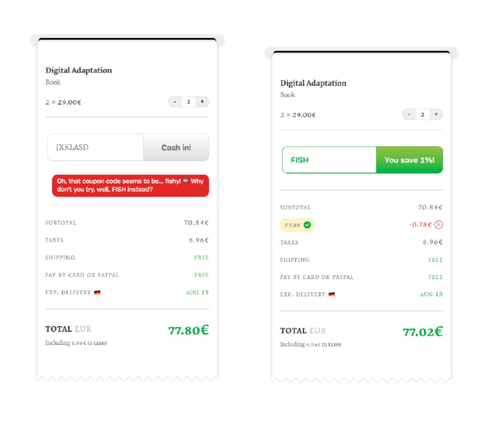 Всем известна проблема с купонами и промокодами. Люди пытаются найти их в Google и ввести, чтобы получить скидку. Причем 90% найденных промокодов не работают. В нашей форме неважно, какой номер ты вводишь, правильный или нет, мы выбиваем сообщение об ошибке. Вместо промокода предлагаем ввести слово “FISH”. После это ты получаешь целый 1% скидки.