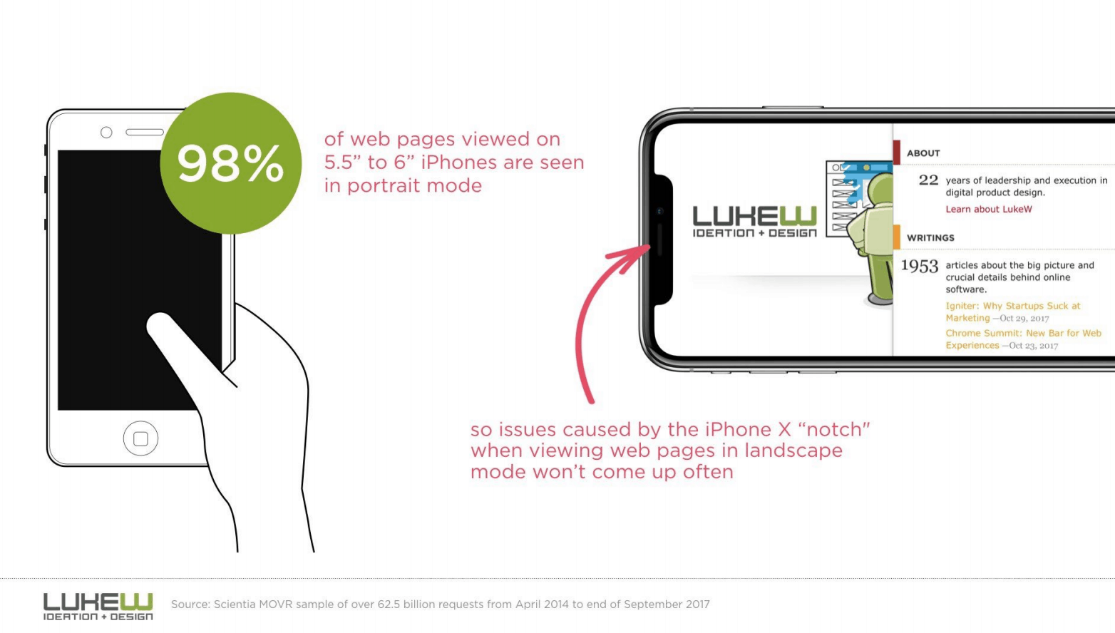 Сколько споров идет насчет «челки» iPhone X? Все дизайнеры в панике, все бросились решать эту проблему. Но если посмотреть статистику, то 98% людей считывают информацию с айфона в portrait режиме. Получается, что проблема «челки» влияет всего на 2% пользователей.