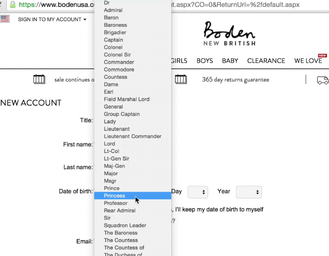 Любой скучной вещи можно добавить personality. Взять, к примеру, title. Ну что может быть скучнее тайтла? Ты просто выбираешь, кто ты — Ms, Mrs или Mr. Но почему бы не предложить больше? Может быть, вы лорд? Или принцесса?