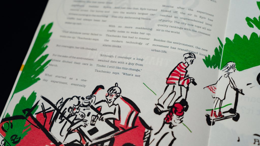 «Тому більшість часу ми провели в брейнштормах і обговореннях. Процес же створення продукту видався дуже інтенсивним — підготовка історій, ілюстрацій, друк. Для якихось статей, як от «Kyivans ditch cars to tackle air pollution», спершу потрібно було закінчити редакторський матеріал, вже потім переходити до створення ілюстрацій, тоді як історія з Circle потребувала простіших замальовок».