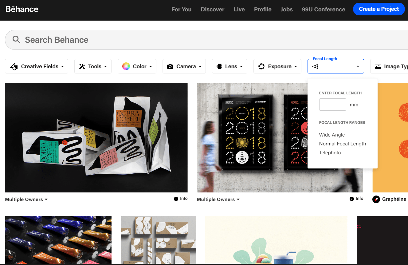 У мережі сайтів і сервісів Behance з’явилися нові інструменти деталізованого пошуку. Можна шукати зображення за певним стилем чи візуальним елементом, а фото — за значенням фокусної відстані, за експозицією та локацією, а також знаходити знімки, зроблені за допомогою конкретної моделі камери.