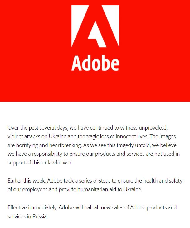 «Adobe негайно припиняє продажі всіх нових продуктів і послуг Adobe в Росії», — повідомляється в офіційному блозі компанії.