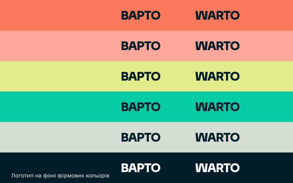 Bulanov büro розробили для агенції «ВАРТО» дизайн-систему та гайдлайн, який дозволить ефективно використовувати всі запропоновані рішення. Зокрема, доповненням до логотипа стала яскрава кольорова гама, призначена для того, щоб розбавити серйозність і мінімалістичність шрифтового рішення та додати акценти.