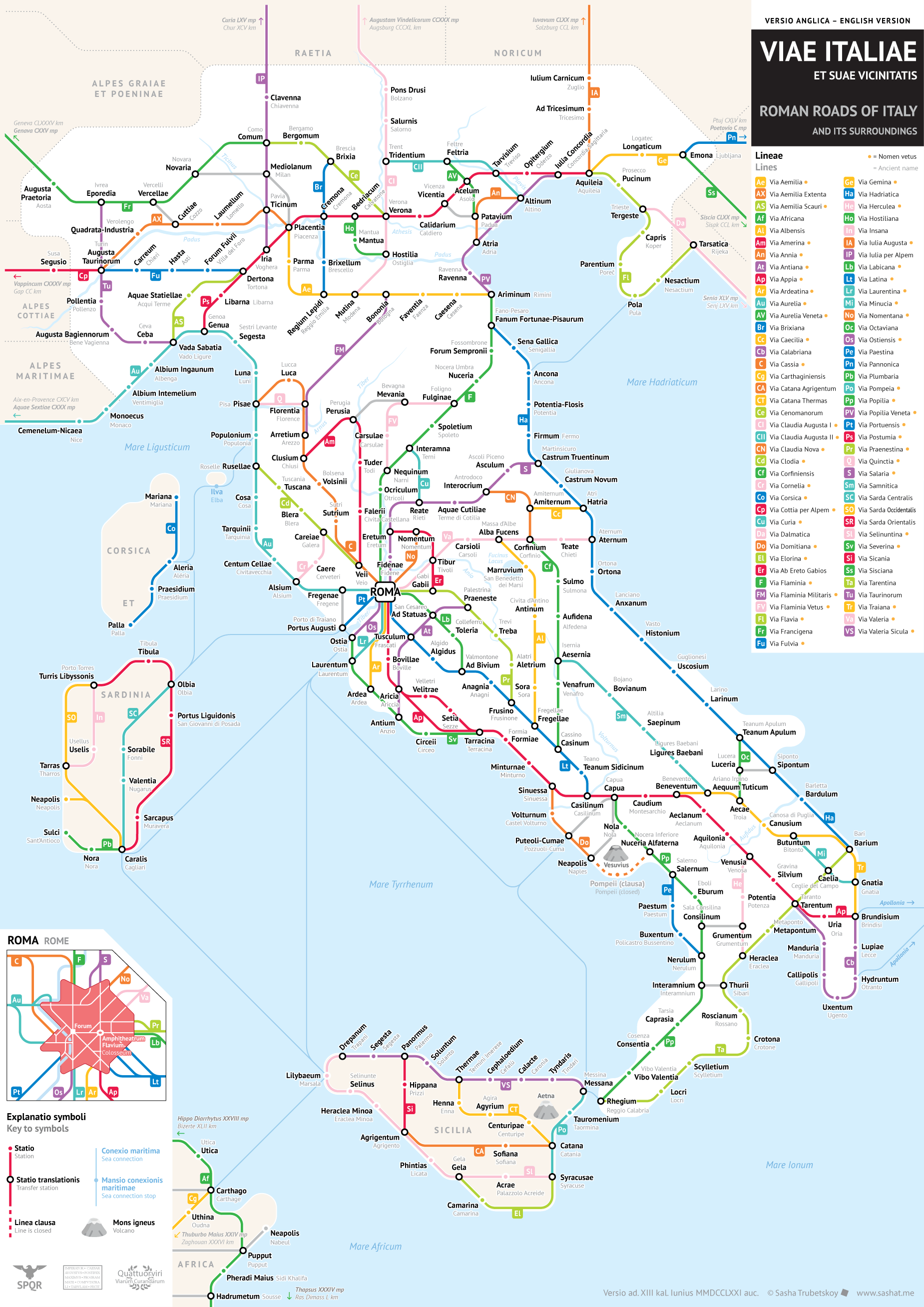 «Мені пощастило, що римські дороги Італії досить добре вивчені та задокументовані, особливо коли мова йде про їх справжні стародавні назви», — каже Трубецький. «Це означає, що мені довелося використовувати менше художніх образів, щоб зробити схеми схожими на осмислену сучасну карту».