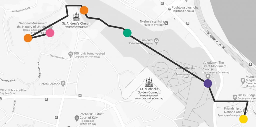 Маршрут тягнеться від Національного музею історії України вздовж Пейзажної алеї до Арки дружби народів.