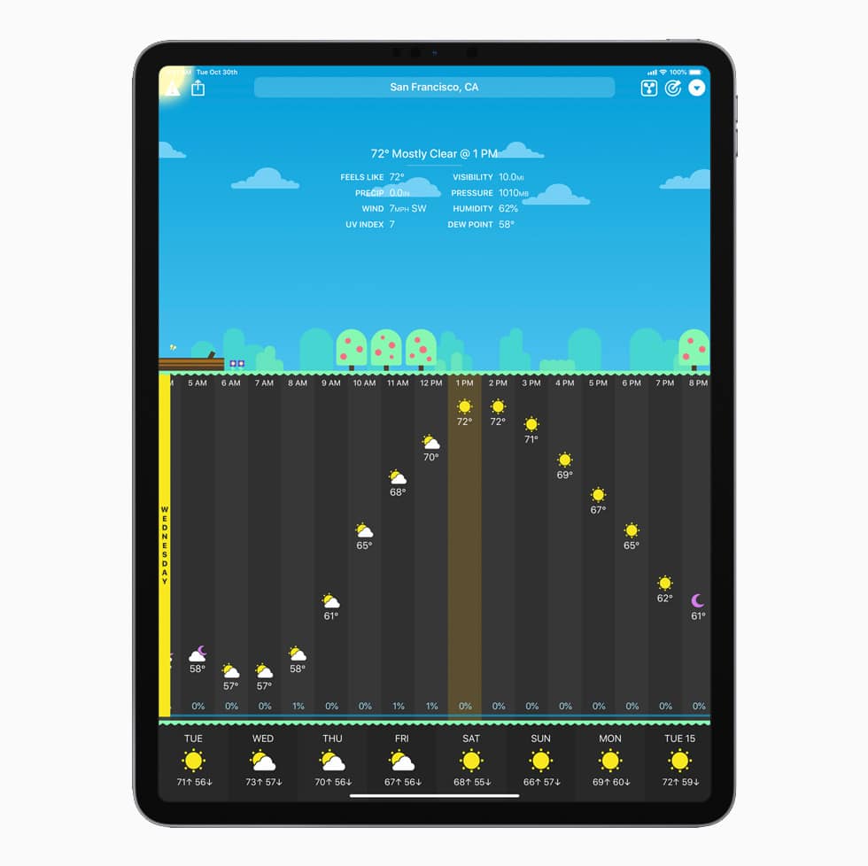 Додаток відомий своїми жартівливими прогнозами погоди й унікальними візуальними ефектами. Нещодавнє оновлення дизайну додало простоти та елегантності його досвіду, пишуть в Apple.