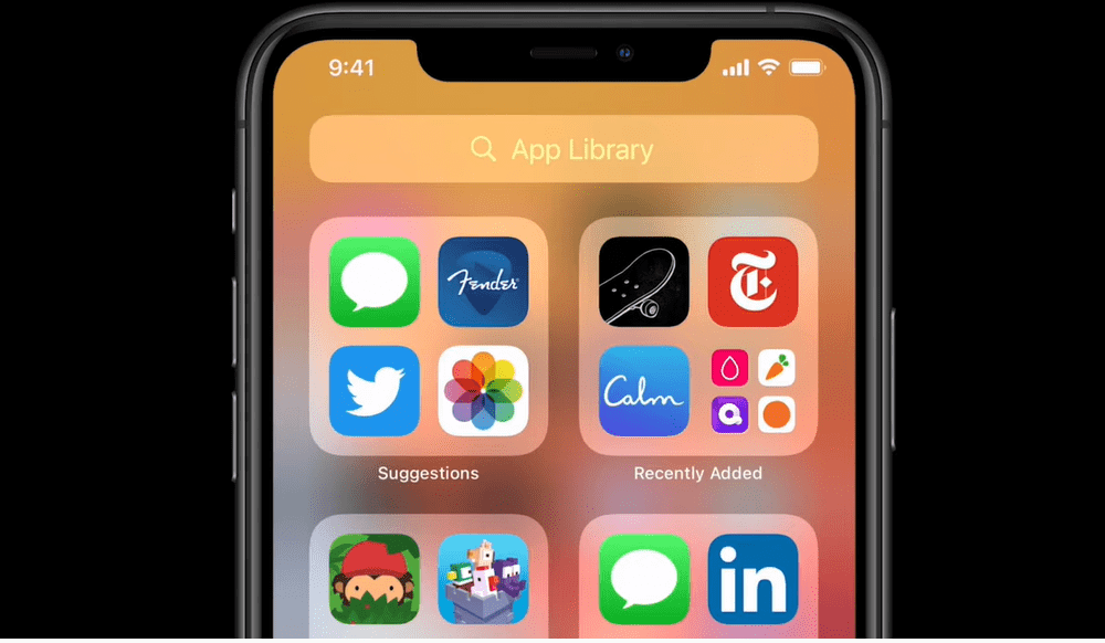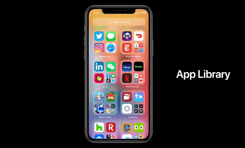 App Library — сервіс для роботи з додатками. Він приховує в спеціальному меню непотрібні додатки з робочого столу та групує їх за категоріями. Тепер програми не будуть губитись між різними робочими столами. Додатки групуються за категоріями автоматично: рекомендовані, розваги, здоров’я і так далі.