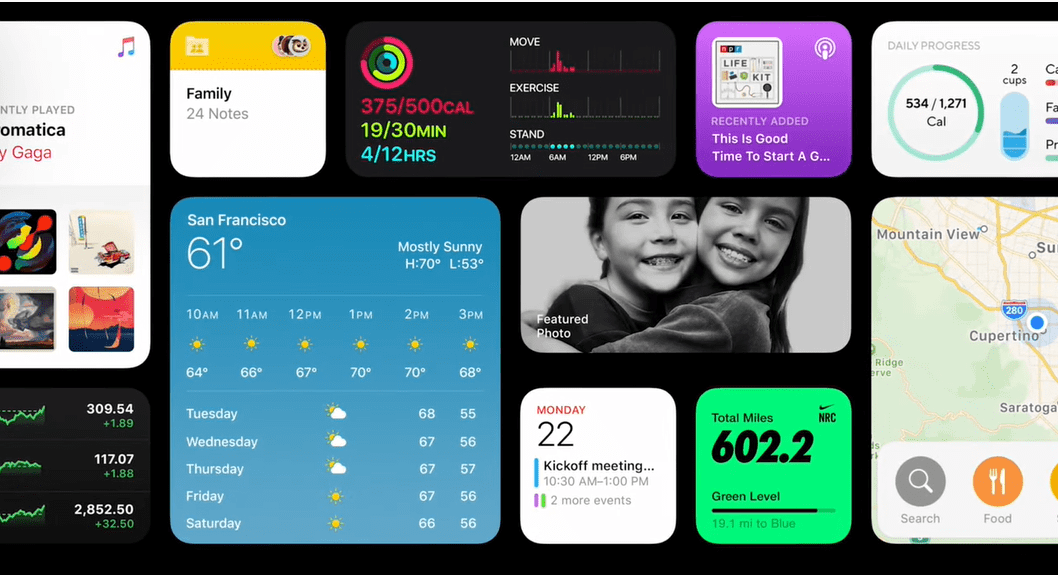 Ще один з інструментів, який презентувала Apple — віджети на екрані повідомлень в iOS 14.  Тепер з’явилася можливість встановлювати їх на робочий стіл. Є також функція вибору розміру. А ще віджети можна змінювати залежно від часу доби — один вранці, інший увечері.