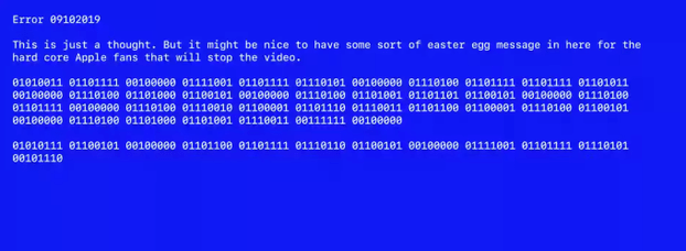 Пасхалку помітив користувач Reddit. Двохвилинний ролик з підсумками двогодинної конференції Apple був розміщений на YouTube і його переглянули понад 16 млн разів. Повідомлення знаходилося на 1:25. Там було написано: «Помилка 09102019: Просто думка. Але було б приємно побачити тут приховане повідомлення для закоренілих фанатів Apple, які зупинять це відео».