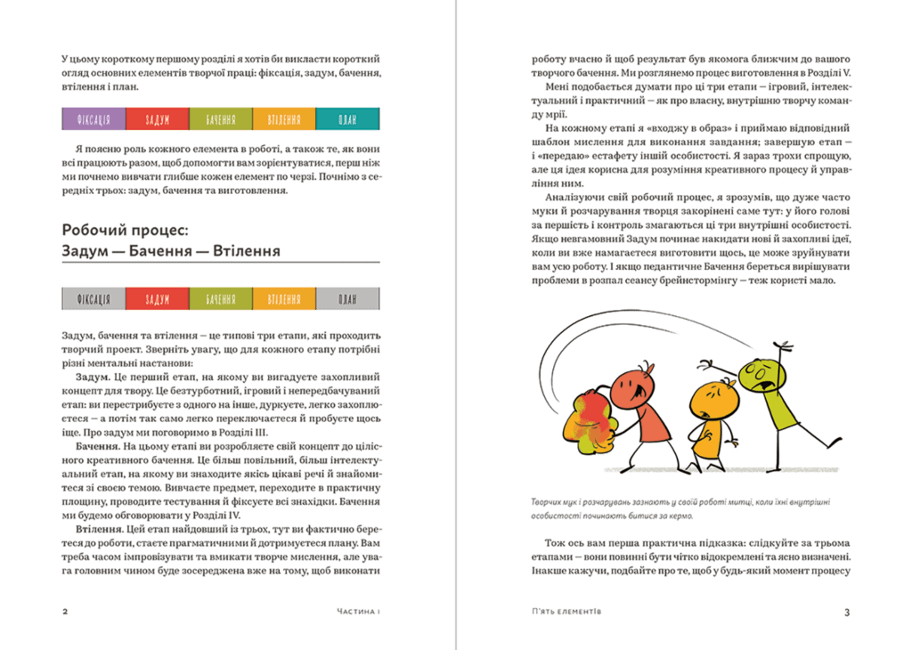 «Це не просто посібник, а готовий ефективний інструмент, який допоможе розбити проєкт на етапи й фрагменти, розділити у своїй голові ролі митця, критика й менеджера, збалансувати раціо та емоцію. А ще Дорон Маєр пише казку про Червону Шапочку — але це вже читайте в самій книжці», — розповідають у видавництві про книгу.