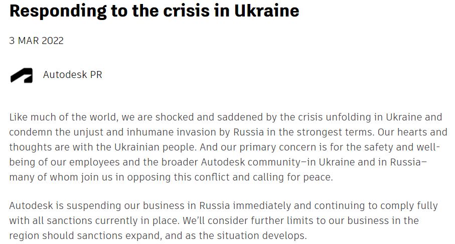 «Autodesk негайно призупиняє нашу діяльність у Росії та продовжує повністю дотримуватися всіх санкцій, які зараз діють. Ми розглянемо додаткові обмеження для нашого бізнесу в регіоні, якщо санкції розширяться, а також відповідно до розвитку ситуації».