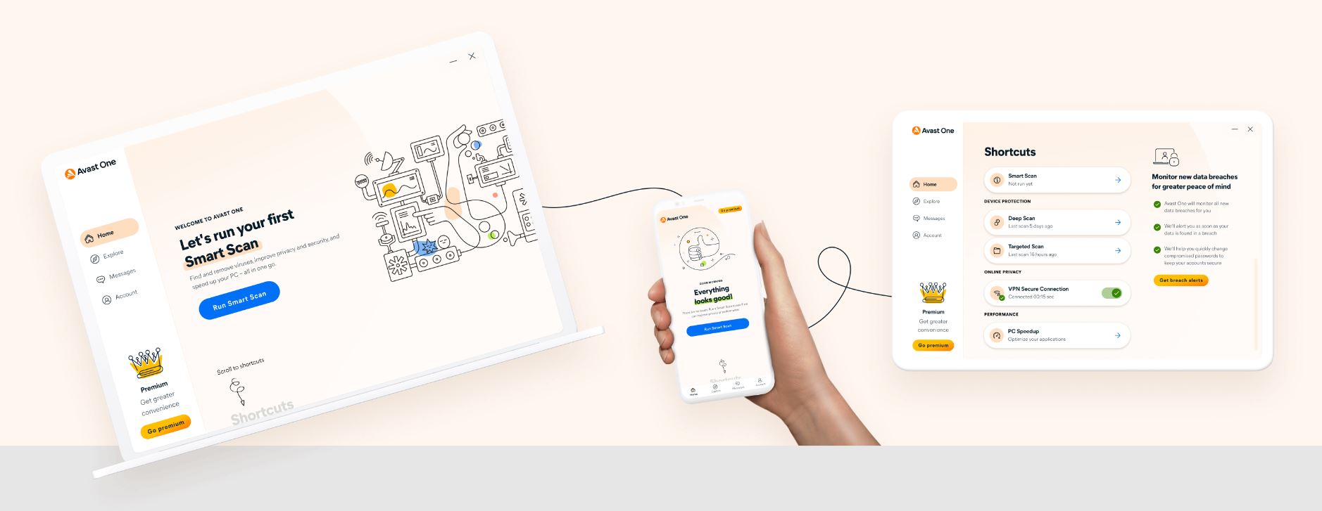 Дизайн Avast One легкий та яскравий з округлими кнопками в інтерфейсі. На кожній сторінці – власна ілюстрація в пастельних кольорах.