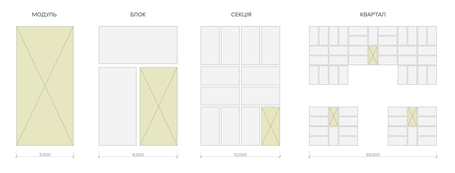 Розмір житлового блоку універсальний, тобто можна побудувати містечко з будь-яких запропонованих блоків, які відповідатимуть конкретним запитам.