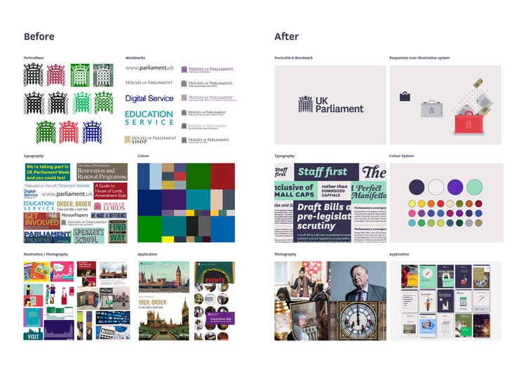Новий стиль включає логотип з полегшеною версією традиційних брами й корони, який адаптується під різні розміри. Його розробкою займалась студія брендингу SomeOne, яка базується в Лондоні та Сіднеї. Вона також відома своїми роботами для лондонської Олімпіади 2012, проектами для Intel, Unilever, Domino’s. Протягом всього часу зі студією активно співпрацювали представники парламенту.