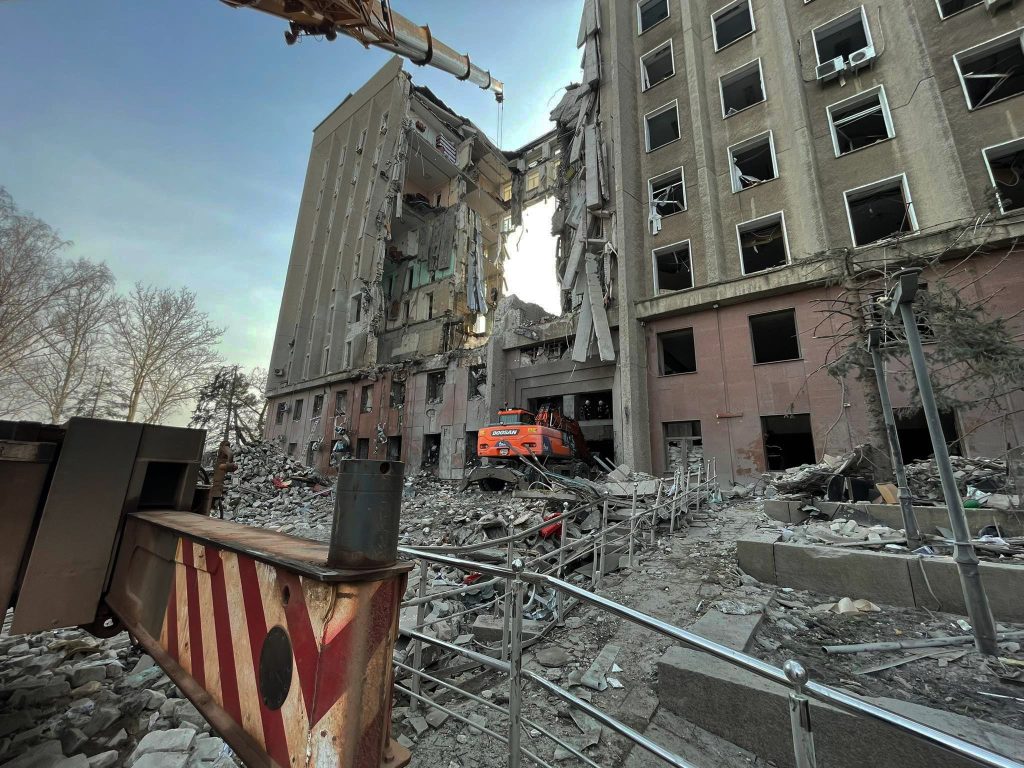Центральна секція будівлі Миколаївської ОДА була зруйнована з 9 по 1 поверхи внаслідок обстрілу 29 березня.