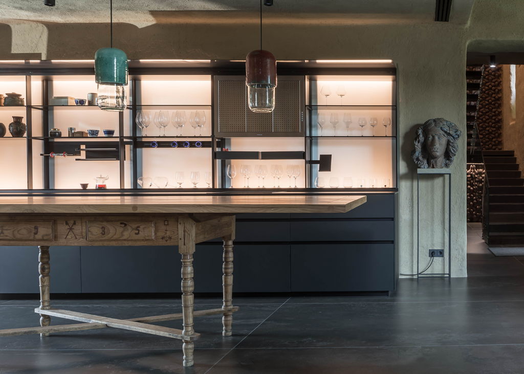 Також було використано морений дуб, а також поєднано сучасні технології з вінтажними об’єктами та давніми українськими традиціями. Так, на кухні поряд з фасадами від італійського бренду Valcucine стоїть гуцульський стіл 1935 року, а на полицях у вітальні Сергій зібрав колекцію кераміки часів Трипілля.