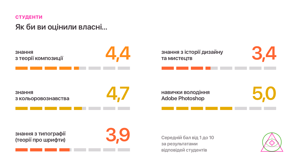 Серія питань присвячувалась поточній підготовці молодих фахівців. Знання оцінювали за 10-бальною шкалою. Власні знання в теоретичних дисциплінах та Photoshop молоді спеціалісти оцінили таким чином: