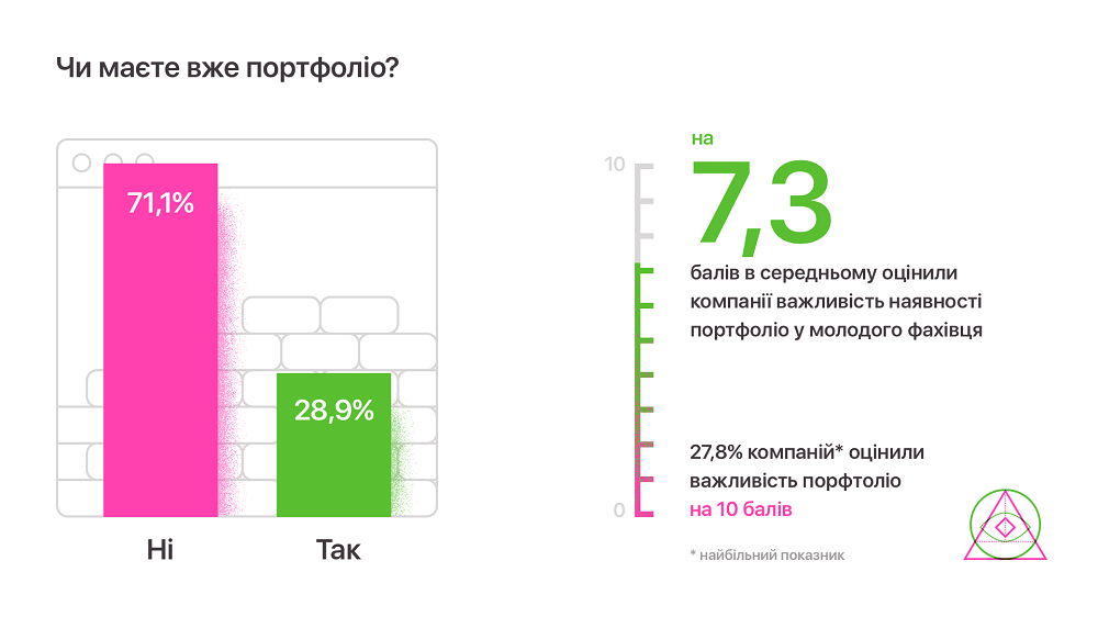 Відносно портфоліо: у 28,9% людей воно є. Роботодавці дають цьому пункту — 7,3 бала з 10.