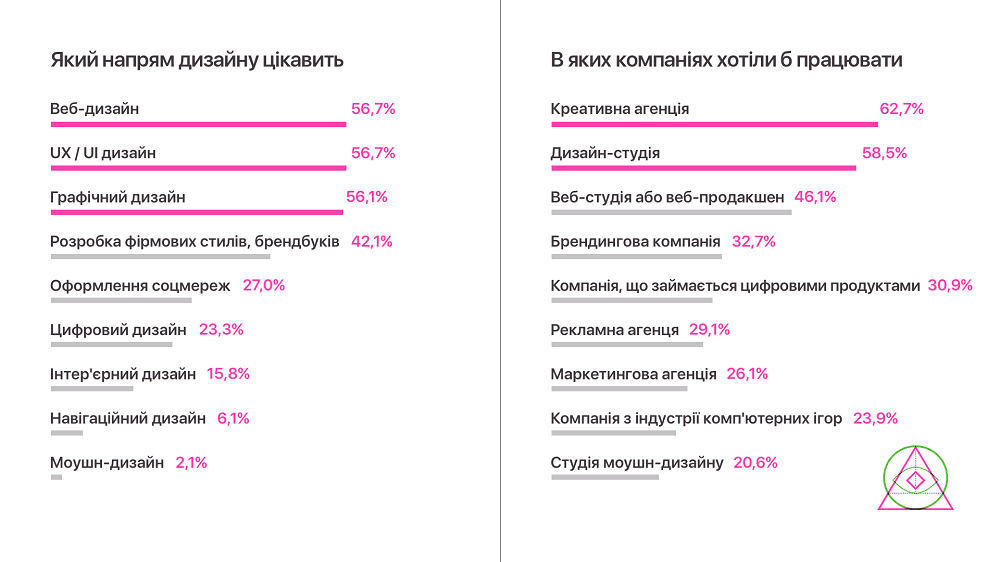 Найбільше майбутніх дизайнерів привертає вивчення напрямків веб-дизайну і UX / UI дизайну (по 56,7%) і графічного дизайну (56,1%). Більша частина опитуваних хотіла б працювати в креативних агентствах (62,7%) і дизайн-студіях (58,5%). На третьому місці — веб-студії та веб-продакшени (46,1%).