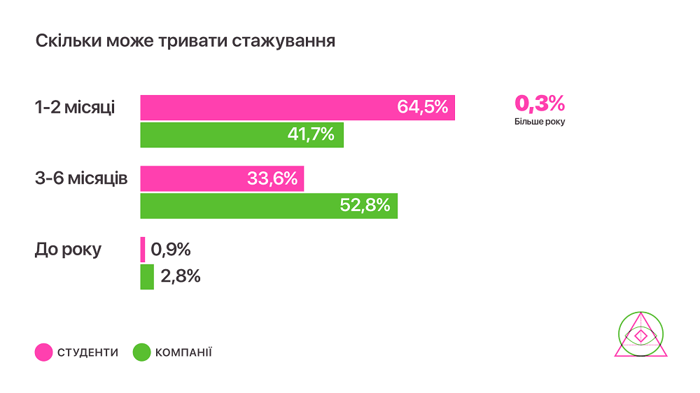 Відносно стажувань: 52,8% роботодавців вважають, що воно повинно тривати не менше 3-6 місяців, а ось більшість студентів схиляється до тривалості в 1-2 місяці.