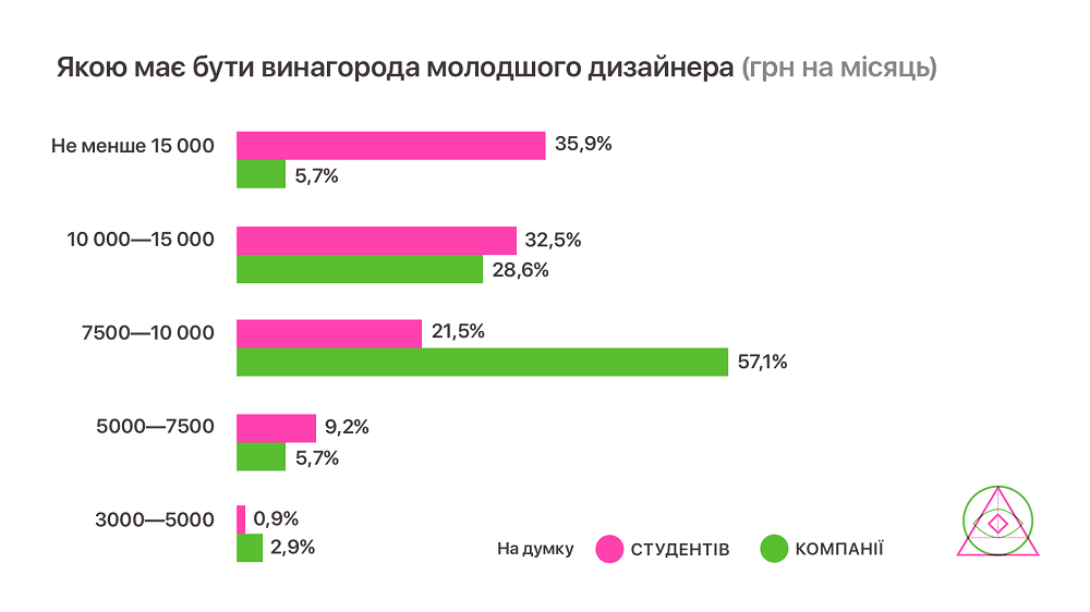 35,9% респондентів прагне отримувати на позиції молодшого дизайнера не менше 15 тисяч гривень на місяць. Трохи менша група людей, яка вважає прийнятним 10-15 тисяч. Водночас 57,1% представників компаній вважають справедливим винагороду від 7500 до 10 000 грн на місяць.